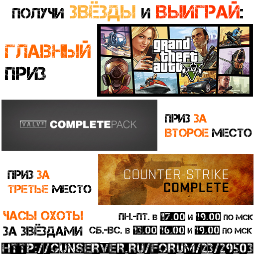 По итогам конкурса будет определено два основных победителя - первый с серверов [CS:S] Public #1 и #2, и второй с сервера [CS:S] DeathMatch. Каждый из них получит лицензионный ключ на Steam версию игры Grand Theft Auto V и VIP Элит на одну неделю!